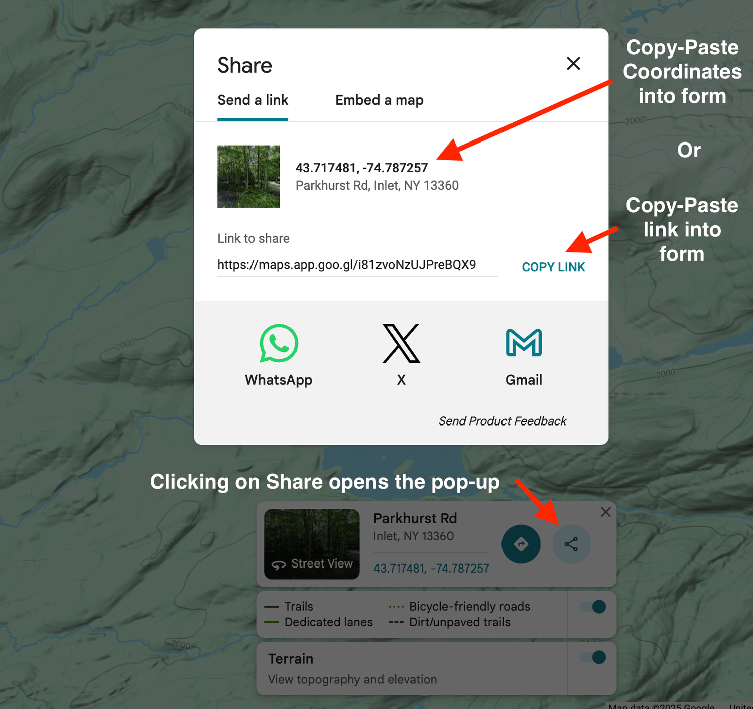 - copy-paste the geo coordinates or the 'copy link' and paste into the form