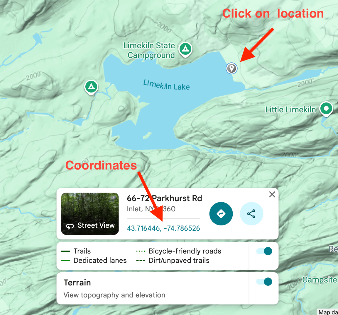 - Find the two numeric marker geo points (sample - 43.717481, -74.787257).