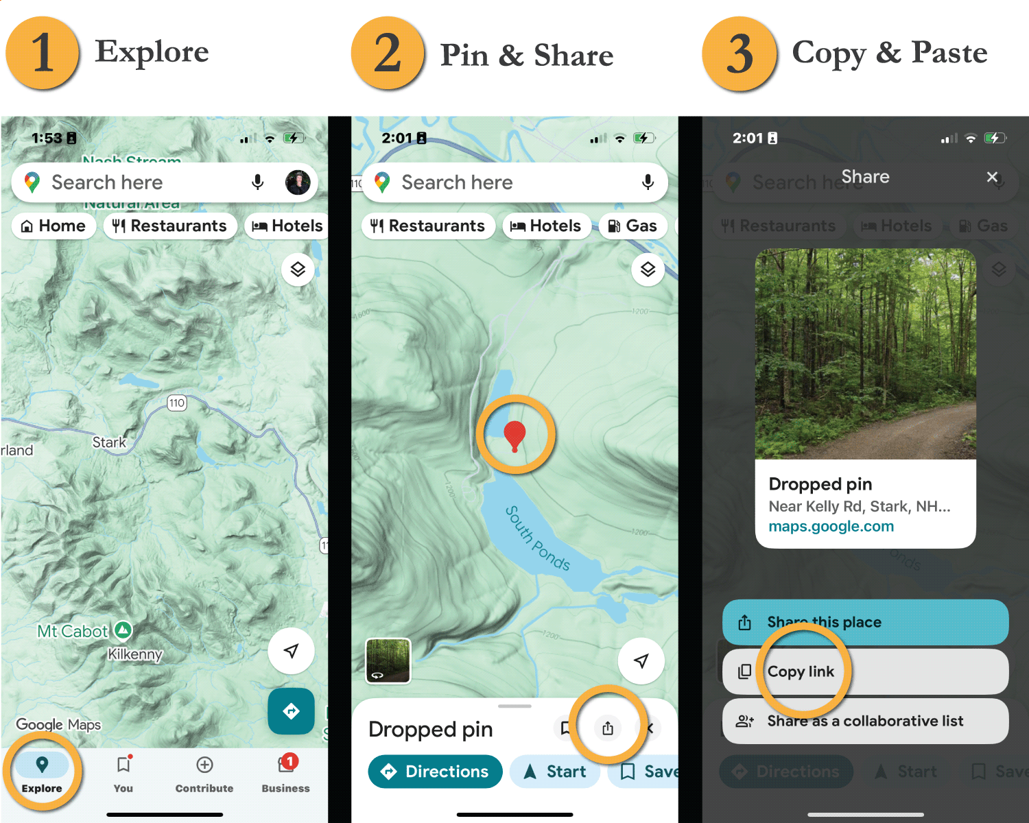 NOTE: A single link is generated for a pin regardless of how much surrounding terrain is visible. This link can be used for the map's general location, but an additional screenshot of the overall area would be helpful. Email this to: our team.
