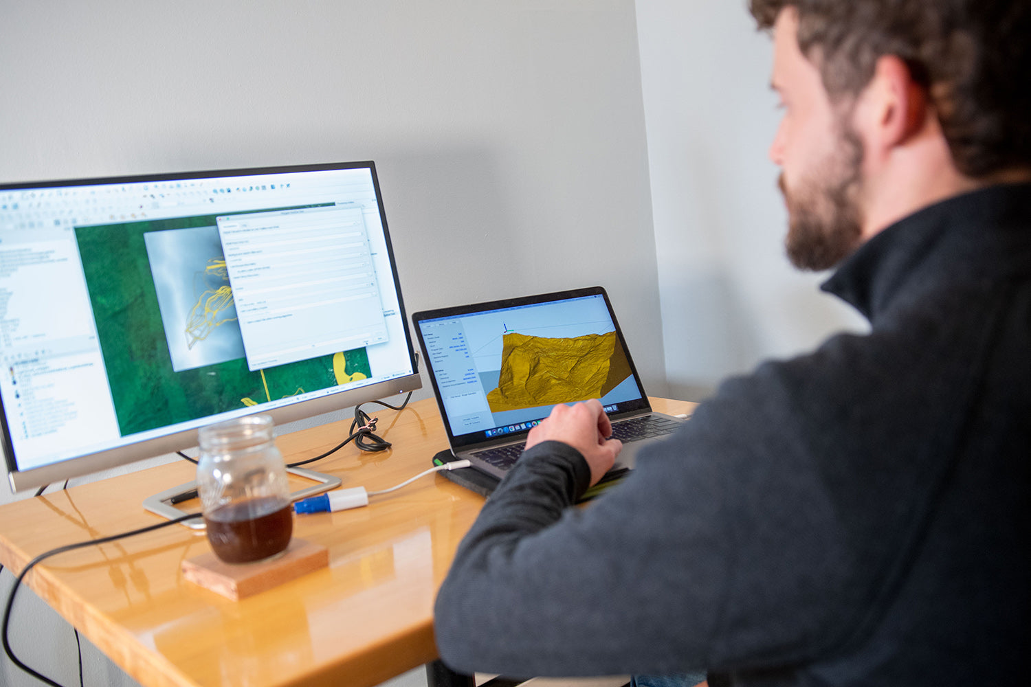 Our process begins with your story. Using GIS (Geographic Information System) technology, we create a 3D digital rendering that centers the mountains, trails, roads, and shorelines where your story takes place. That model is sent to our CNC Router, a computer-controlled drill bit, to capture the topographic landscape with perfect accuracy.