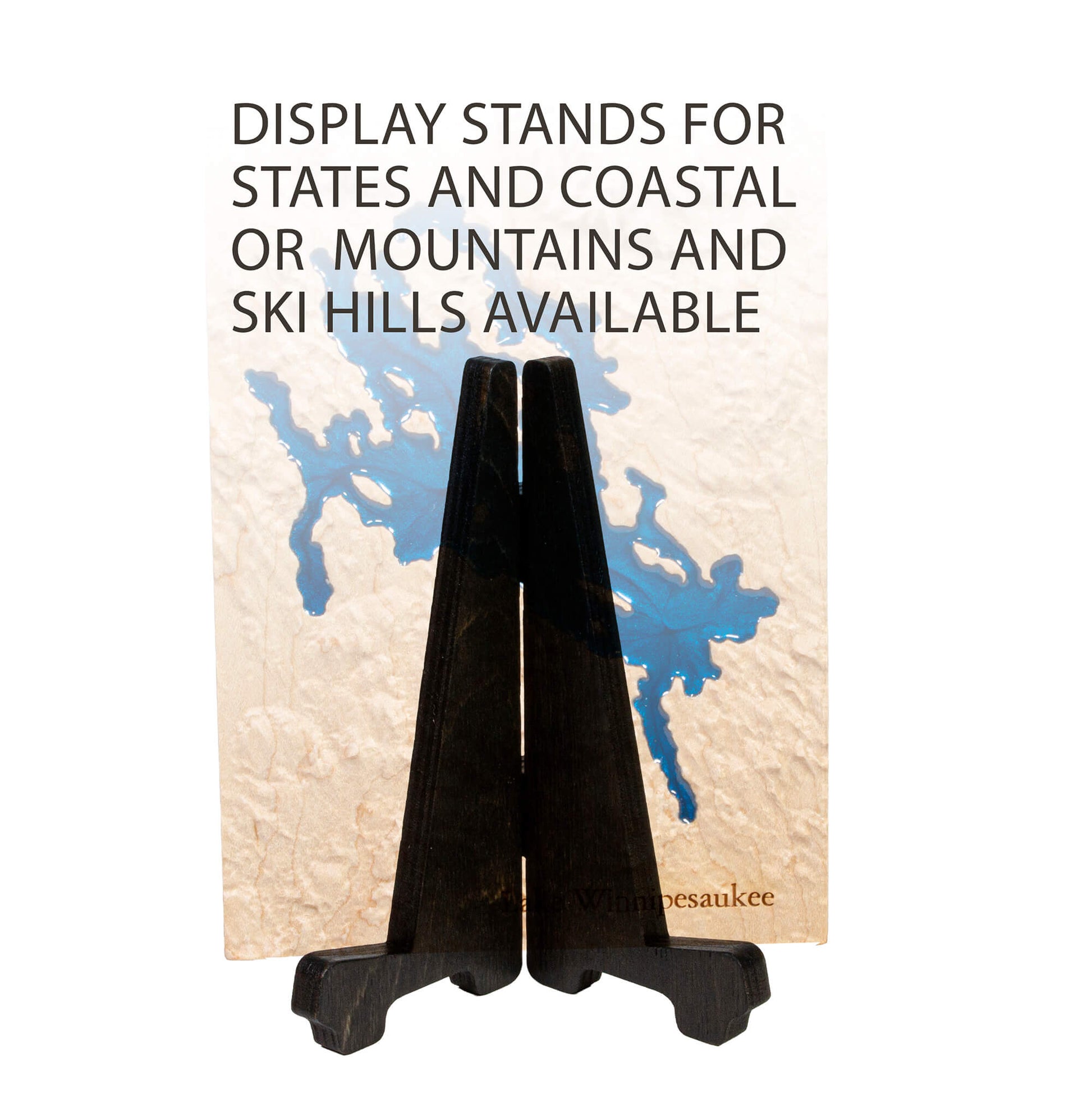 Materials include wood purchased locally from Gagnon Lumber, a family-owned sawmill committed to sustainable timberland management. All maps are coated with linseed oil to protect the wood. Blue epoxy resin used to depict water.